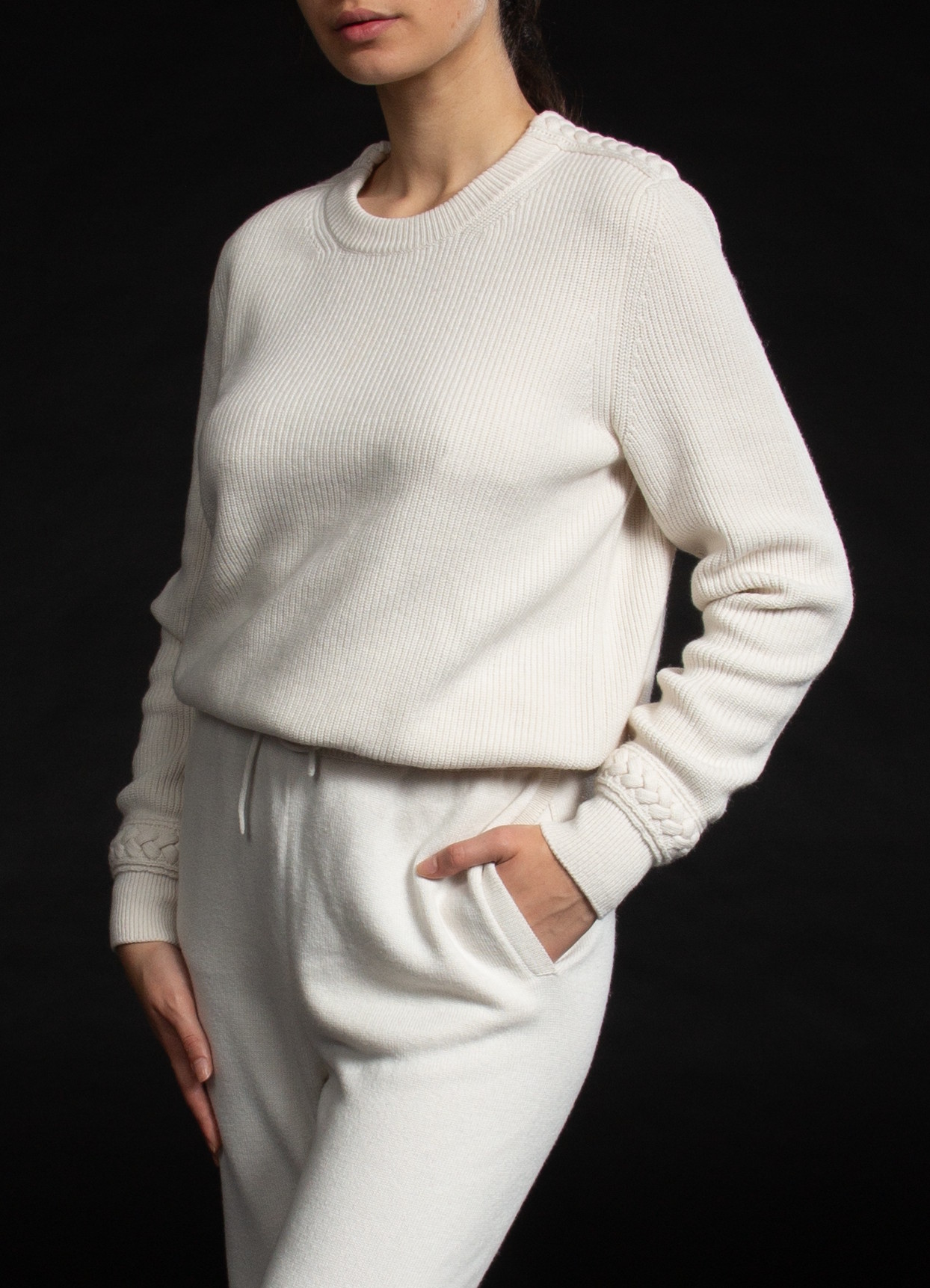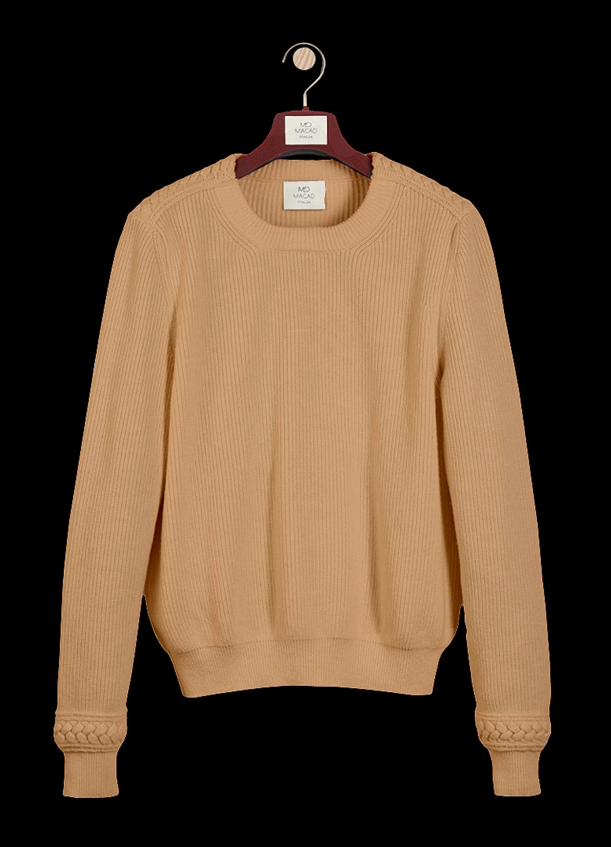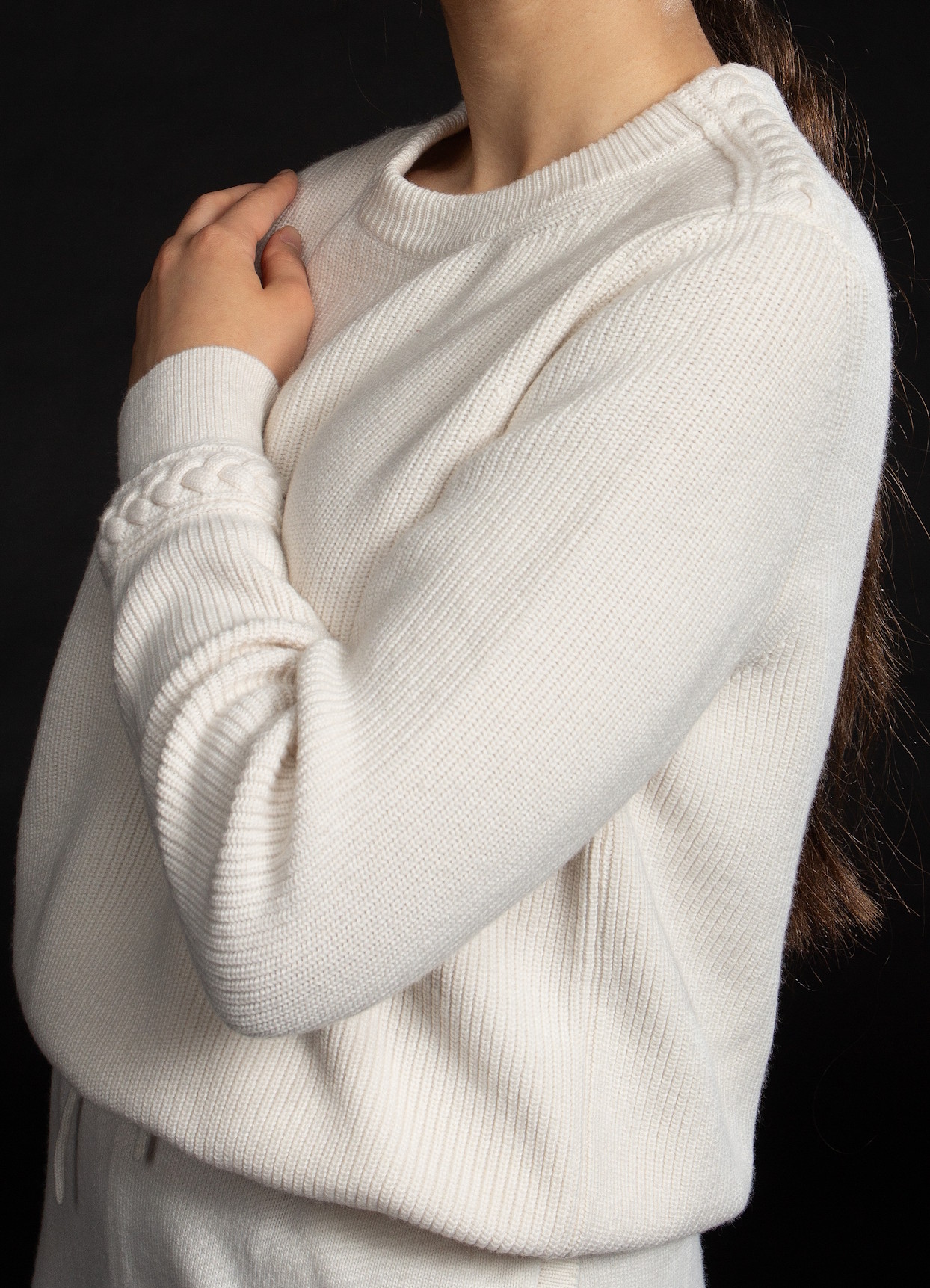 Composizione: pura lana da tessitura Italiana. Lavorazione costa inglese. Tessuto double: 70 % pura lana, 30 % cashmere, treccia “3D” in pura lana