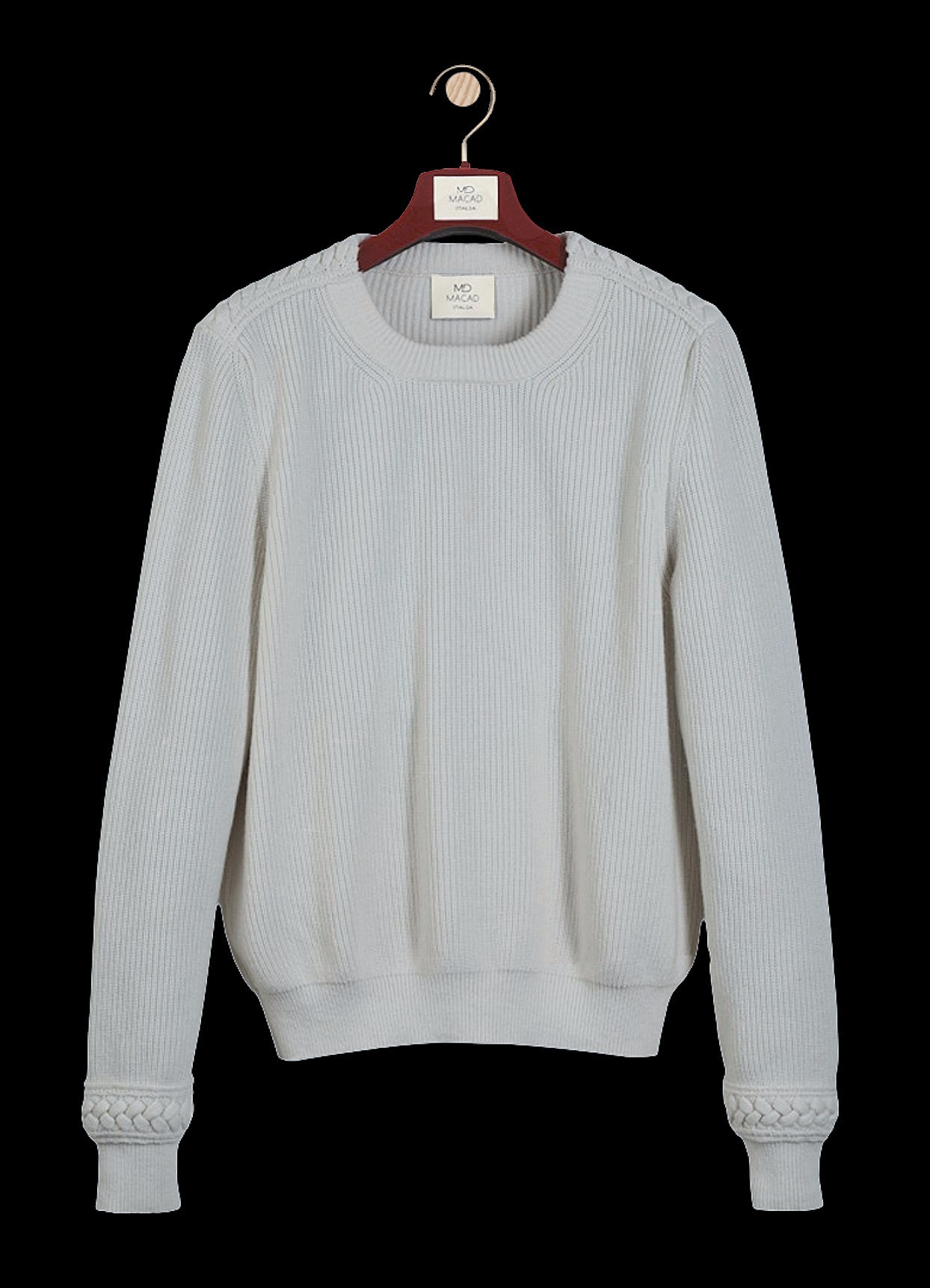L’unione di preziosi materiali quali la maglia con punto costa inglese in pura lana e il tessuto double sapientemente lavorato a mano, conferiscono a questo semplicissimo ma elegantissimo cardigan la sua unicità. Il motivo di trecce in tre "D" cucito a mano esaltano l’attaccatura della manica e le piccole tasche. La raffinatezza e la cura estrema catturano lo sguardo, la semplice cintura aiuta la voluta chiusura del capo e rende facile la portabilità.